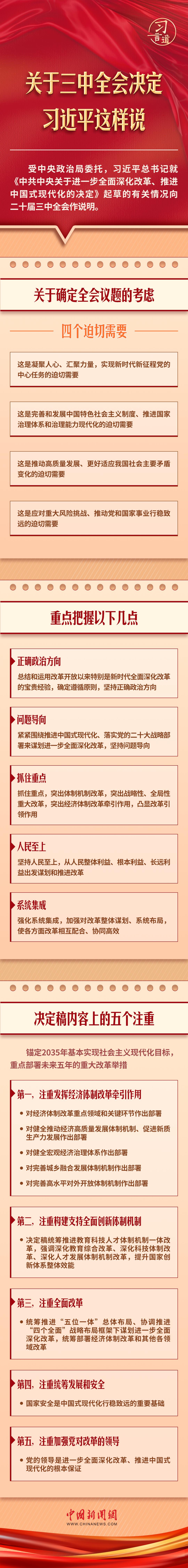 7月21日,二十屆三中全會審議通過的《中共中央關于進一步全面深化改革、推進中國式現代化的決定》和習近平所作的《關于<中共中央關于進一步全面深化改革、推進中國式現代化的決定>的說明》全文播發。