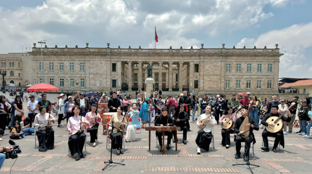>> 2024年3月24日,參加“今日中國”藝術周的中央音樂學院民族室內樂團在哥倫比亞首都波哥大的玻利瓦爾廣場舉辦“快閃”演出。