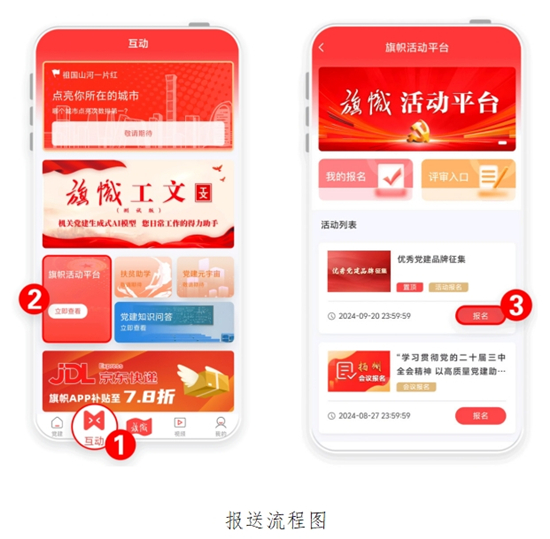 1.通過旗幟App報送(推薦):請在各大應用市場搜索“旗幟”下載旗幟App,在“旗幟活動平臺”中“優秀黨建品牌征集”頁面投稿(詳見報送流程圖)。