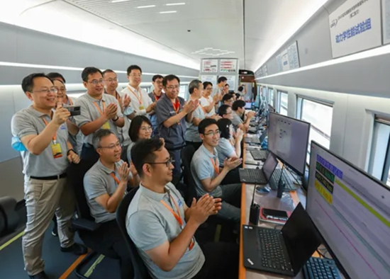 2023年6月28日,臨時黨支部攻關組在福廈高鐵試驗列車上緊盯試驗數據并實現時速451公里安全運行。