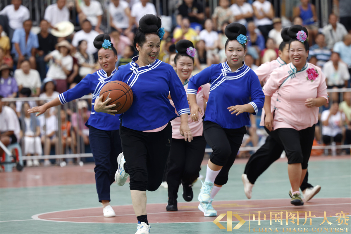 圖8:2023年3月27日,在貴州省黔東南苗族侗族自治州臺江縣臺盤村舉行的村BA女子籃球賽中,運動員奮力比拼。女子籃球賽又被稱為嬢嬢打球,只要不把籃球帶回家,怎么打都行。
