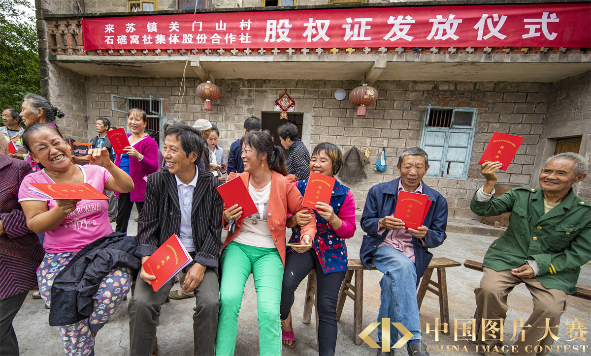 圖集說明:2020年9月28日,在重慶市永川區來蘇鎮關門山村,農民領取農村集體經濟組織股權證。農村集體經濟組織股權證是村集體經濟組織成員所擁有的農村集體股權證,由村集體經濟組織發放,用以證明農民所占有的集體資產股份。