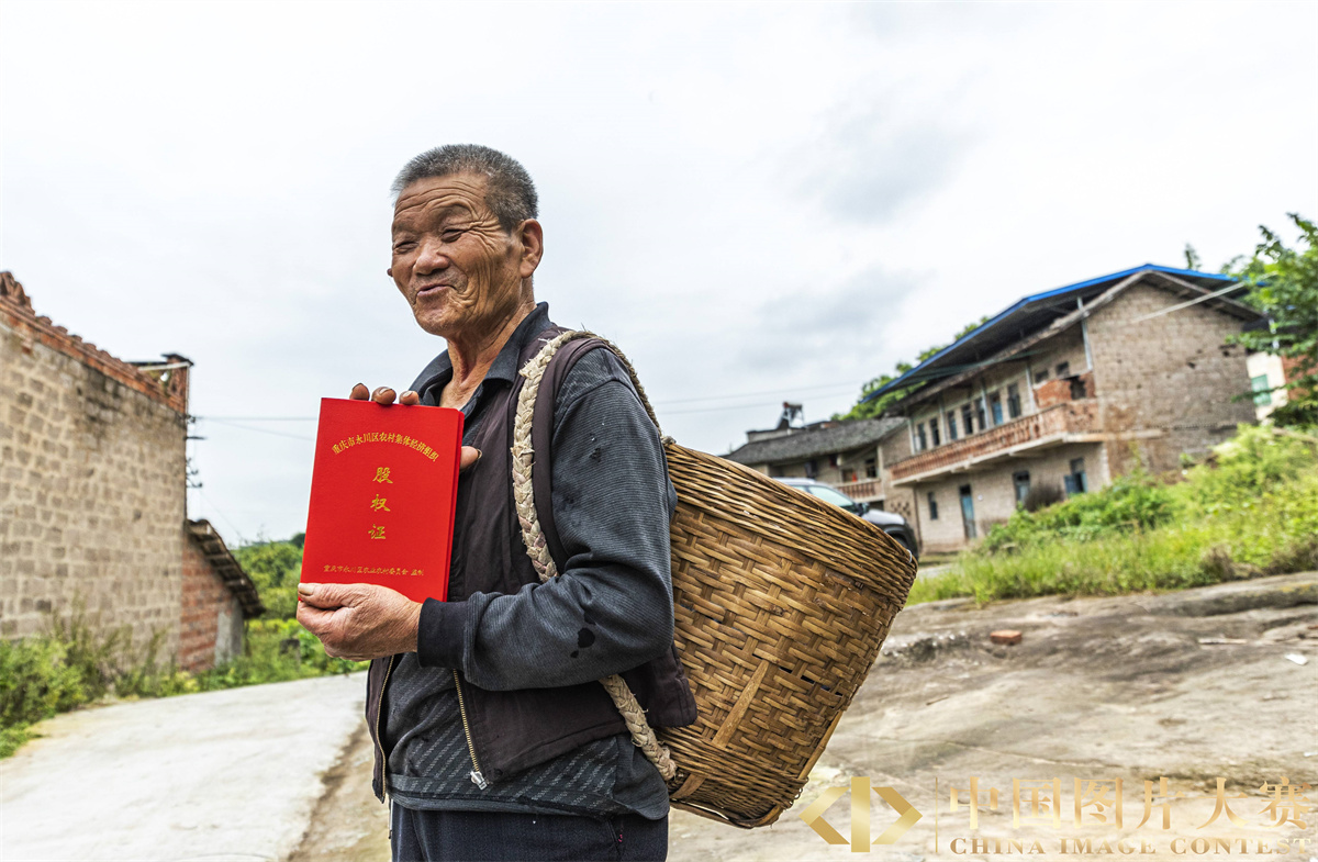 圖6:2020年9月28日,在重慶市永川區來蘇鎮關門山村,村民拿到股權證后拍照留影。
