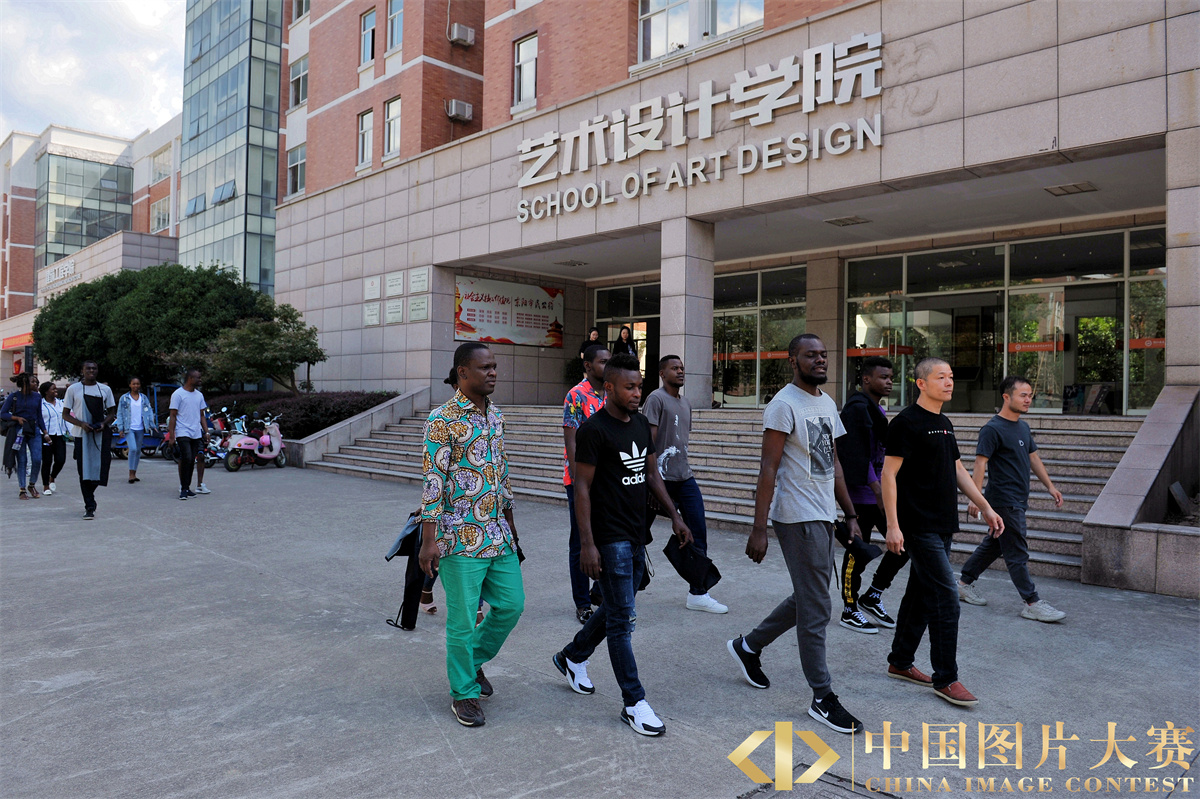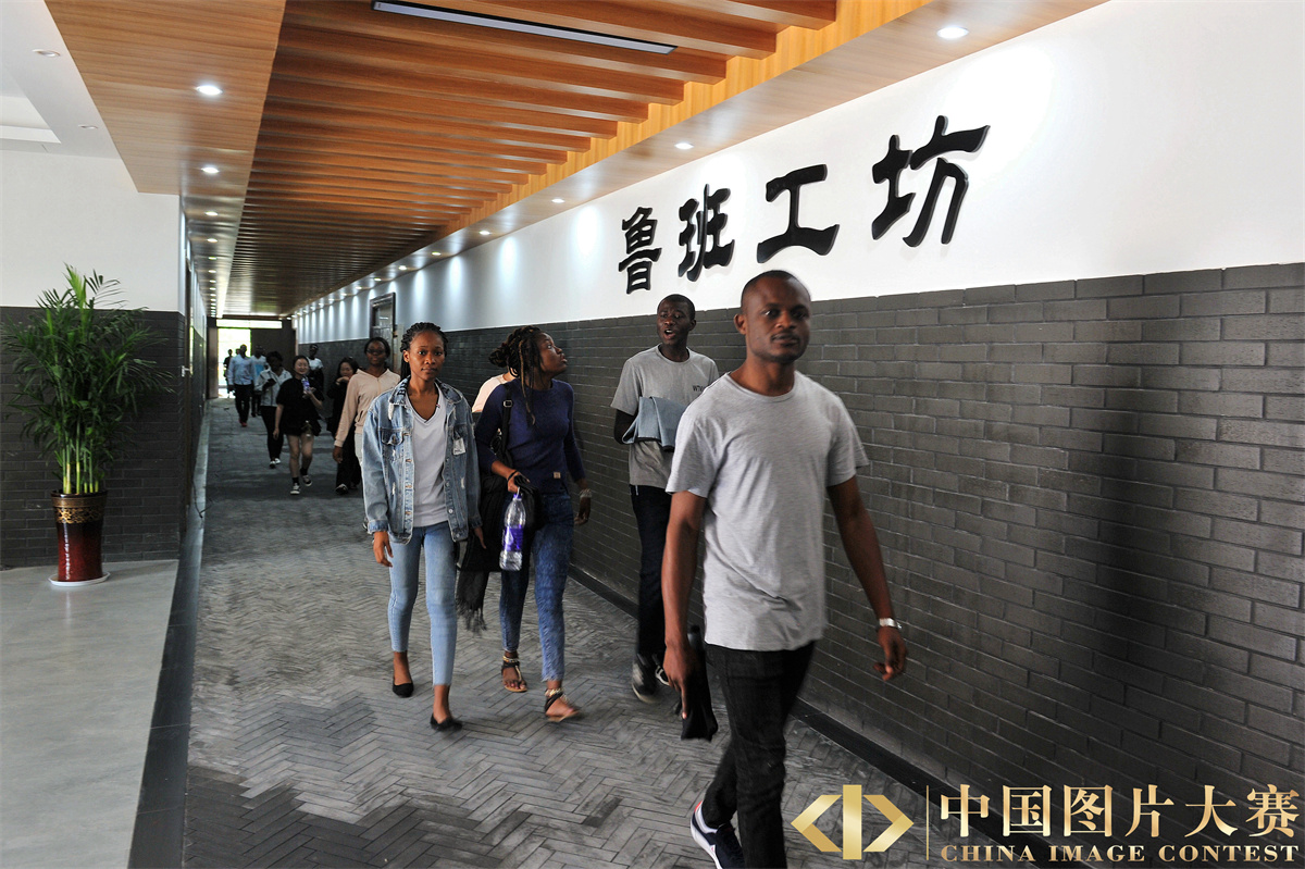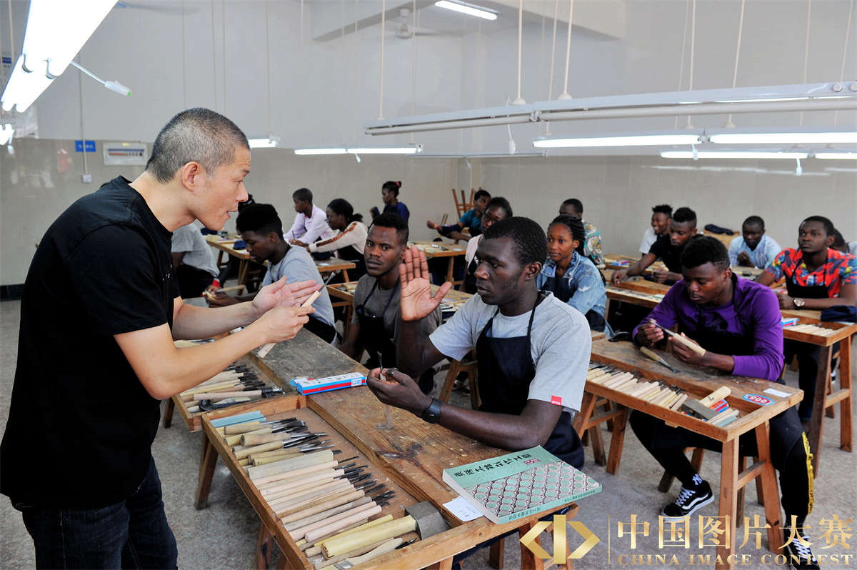 圖集說明:2019年9月20日,在浙江省東陽市浙江廣廈建設職業技術學院藝術設計學院魯班工坊實訓室,木雕國際班班主任杜飛棟給21名來自剛果(布)的留學生上“東陽木雕學習第一課”。這批非洲留學生將在這里進行為期3年的木雕技藝學習。