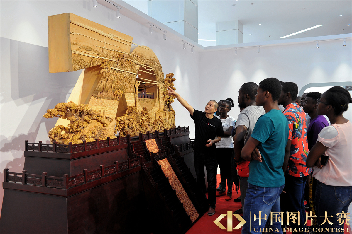 圖4:2019年9月20日,杜飛棟向非洲留學生介紹“大國足跡”木雕作品。