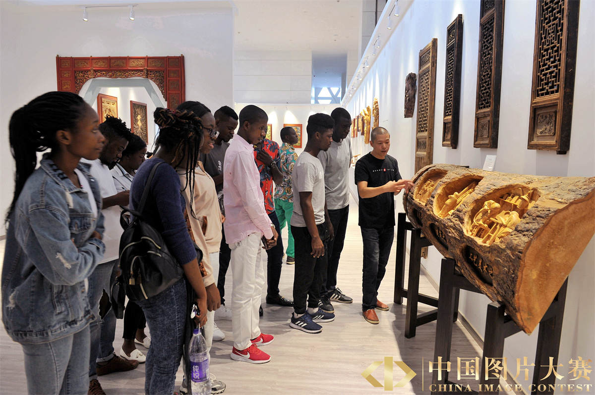 圖2:2019年9月20日,非洲留學生跟隨杜飛棟前往木雕博物館參觀學習。