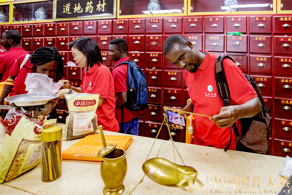 圖3:2019年9月4日,在山東省臨沂市中醫醫院,一名外國留學生在研究中藥房傳統計量工具。