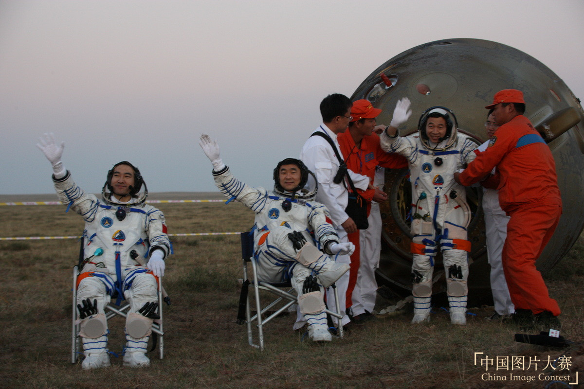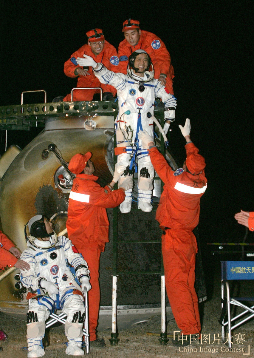 圖6:2008年9月28日,神舟七號載人航天飛船返回艙在內蒙古四子王旗成功著陸,航天員翟志剛、劉伯明、景海鵬依次自主出艙。