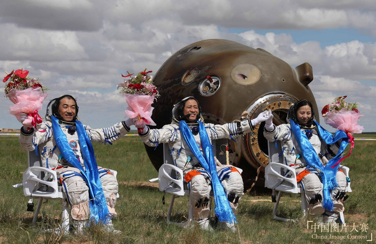圖8:2013年6月26日,神舟十號載人飛船完成繞地飛行和太空試驗任務后順利返回地球,航天員聶海勝、張曉光、王亞平出艙后向人們致意。