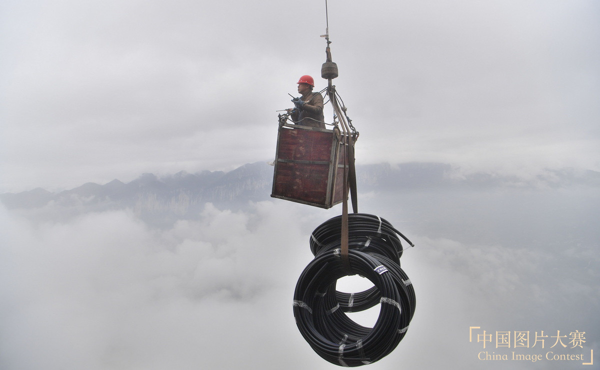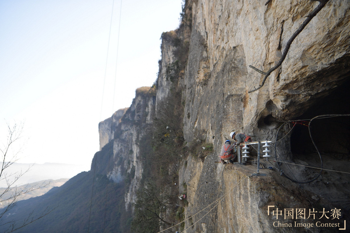 圖4:2018年12月17日,工人在絕壁洞口安裝電力線路。