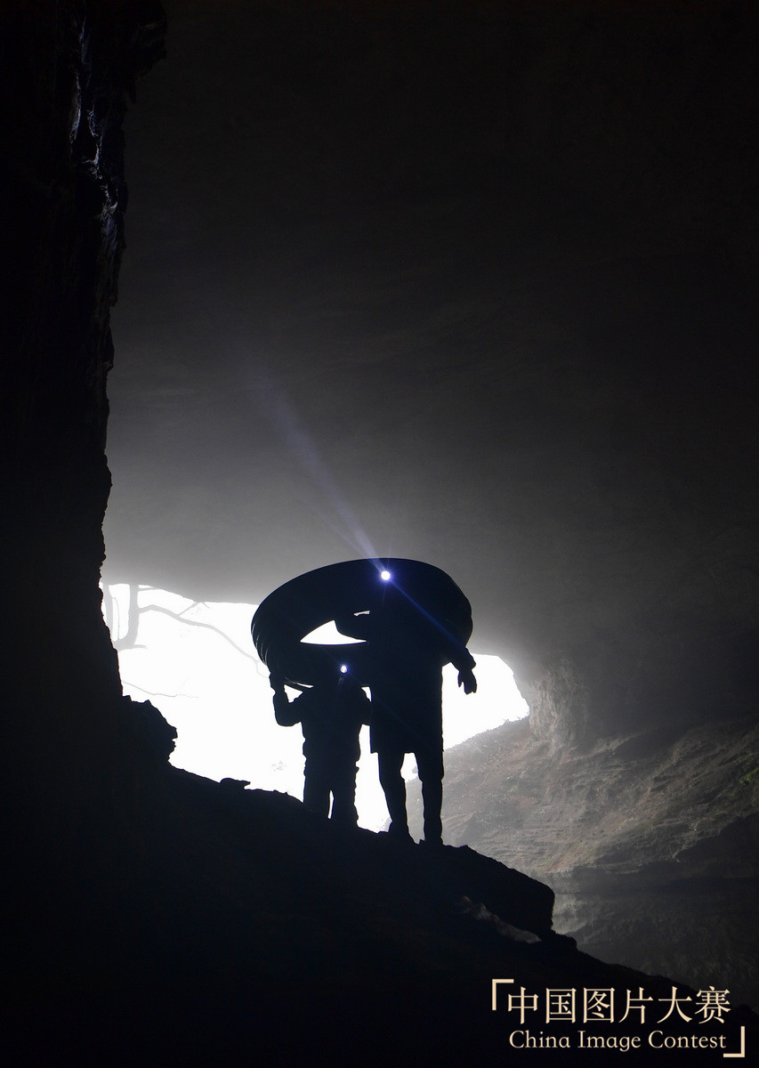 圖2:2018年11月13日,工人在天寶洞內搬運水管。