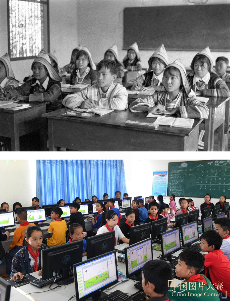 圖2上圖:1984年拍攝的基諾山的學生在上課。下圖:2018年11月20日拍攝的基諾山基諾族鄉民族小學的學生在上計算機課。