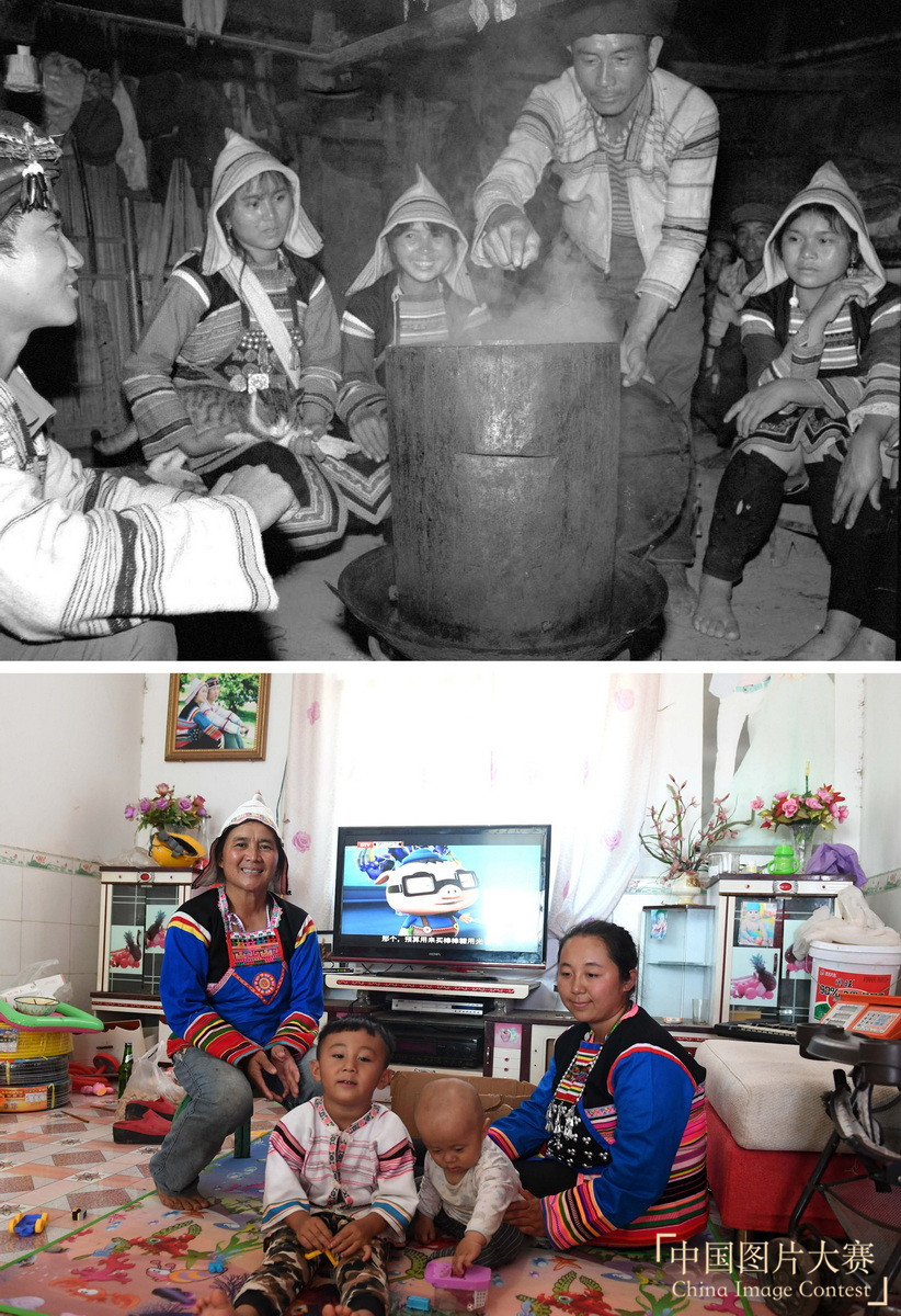 圖3上圖:1984年拍攝的腰則(左二)和家人及朋友在屋里準備吃蒸好的米飯。下圖:2018年11月20日拍攝的腰則(左一)和她的兒媳婦(右一)及腰則的兩個孫子在家里的畫面。