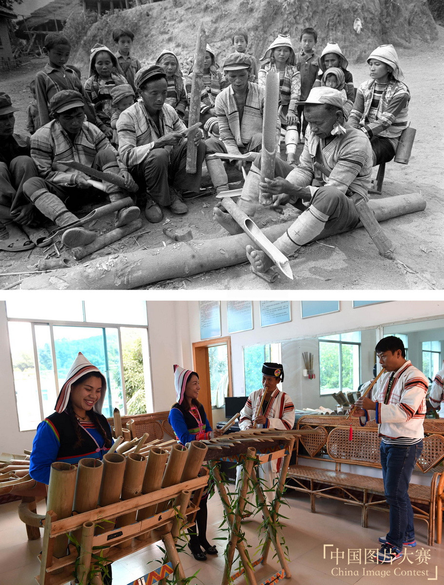 圖5上圖:1988年拍攝的基諾山的基諾族群眾使用竹筒樂器在村寨里演奏。下圖:2015年11月5日拍攝的基諾山基諾族鄉文化站的幾名工作人員在演奏民族樂器。