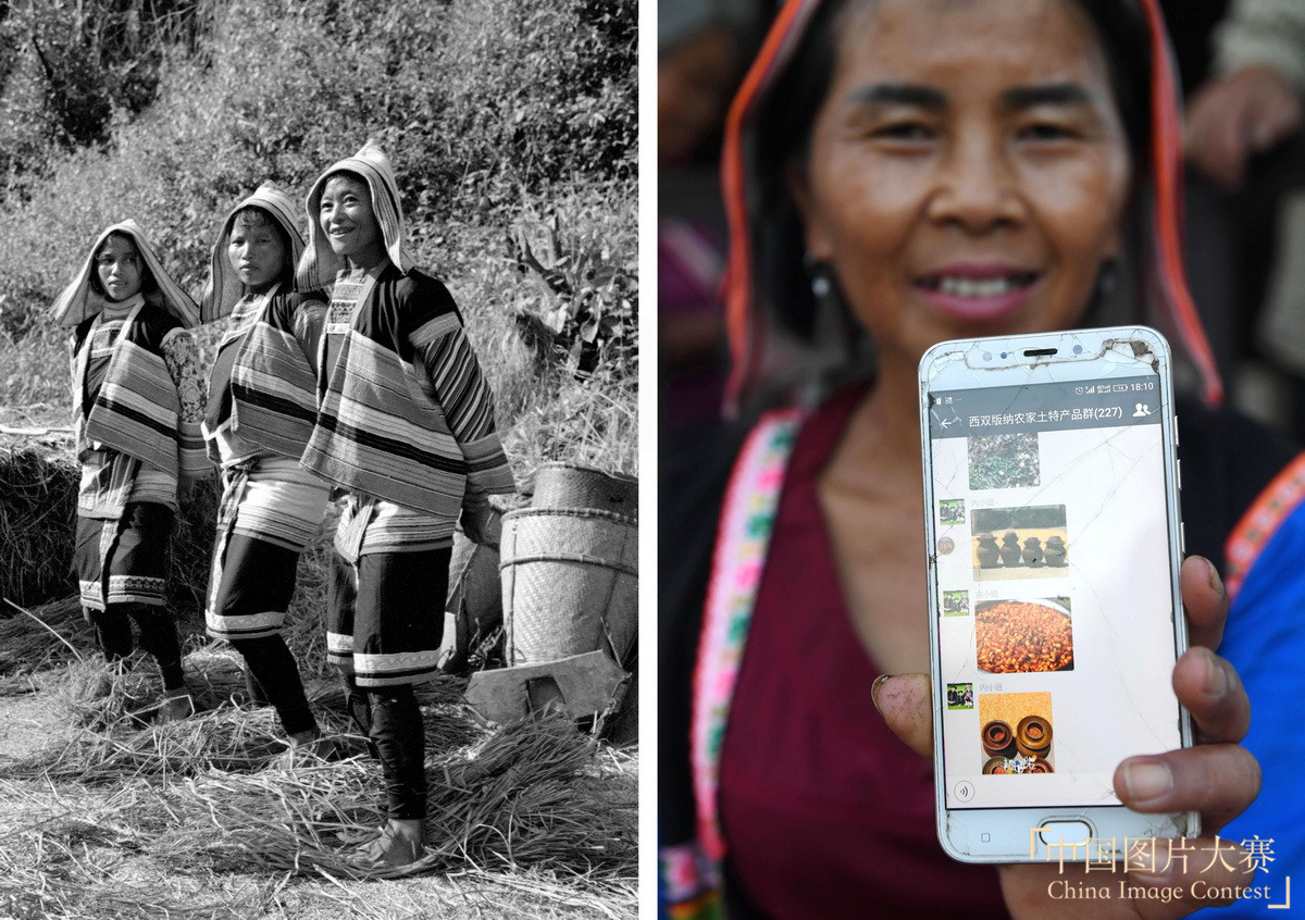 圖6左圖:1984年拍攝的基諾山的幾名基諾族婦女用腳踩稻穗脫粒的場景。右圖:2018年11月20日拍攝的基諾山基諾族鄉巴卡村的基諾族婦女李秀珍用手機展示用于出售土特產的微信群。