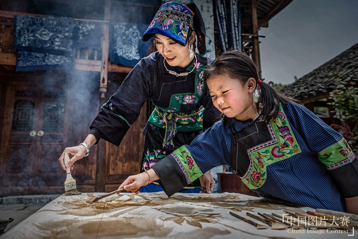 圖1:2020年4月25日,蠟染傳承人石杰忠(左),現場培訓傳授蠟染技藝。