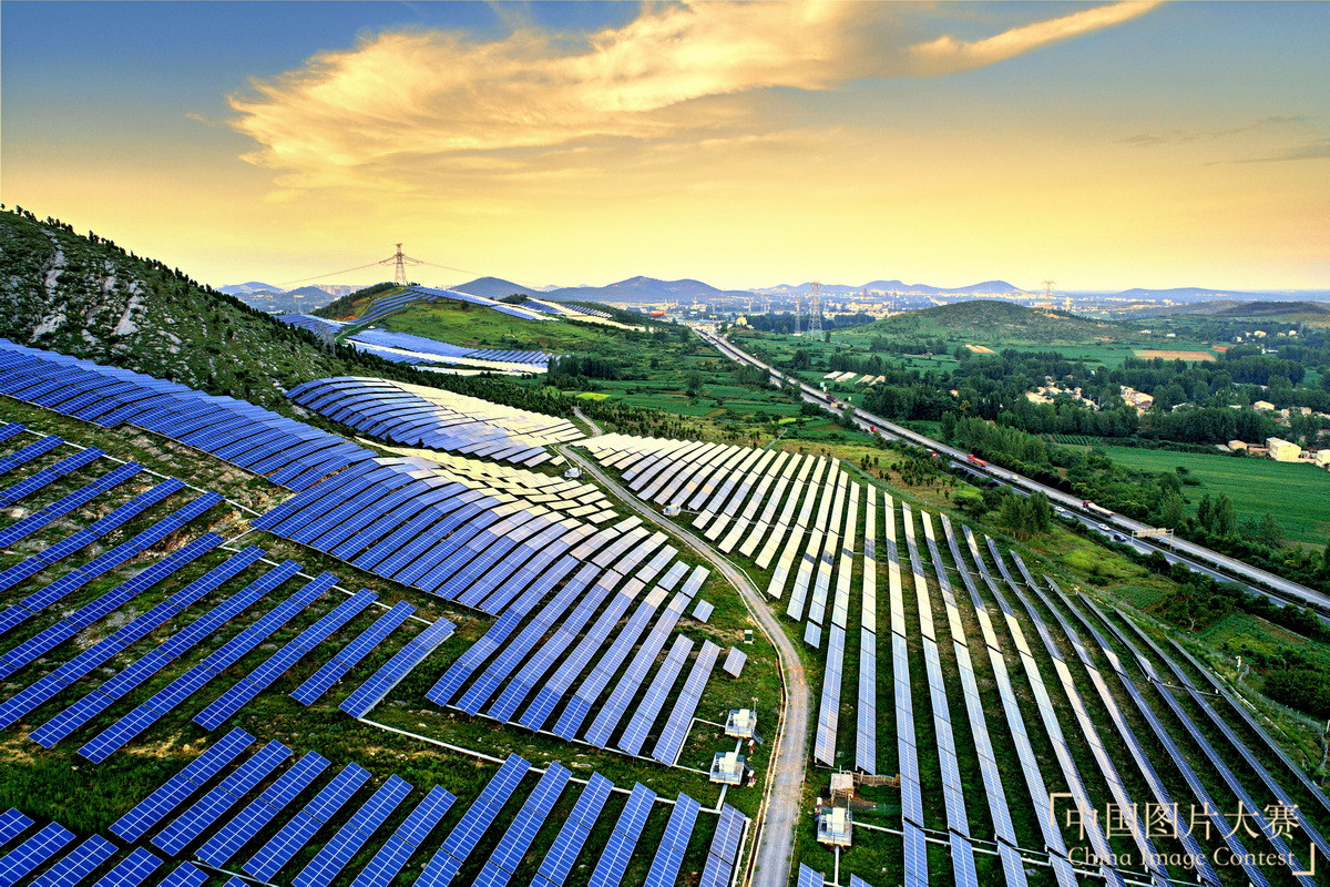 圖6:2017年7月10日拍攝的安徽省宿州市蕭縣朱圩子高速樞紐。當地政府利用荒山荒坡,發展光伏發電產業,大力發展綠色清潔能源,在G30高速兩側形成了特有的景觀。