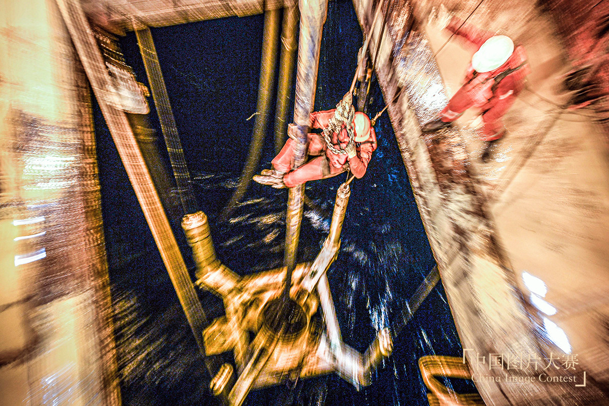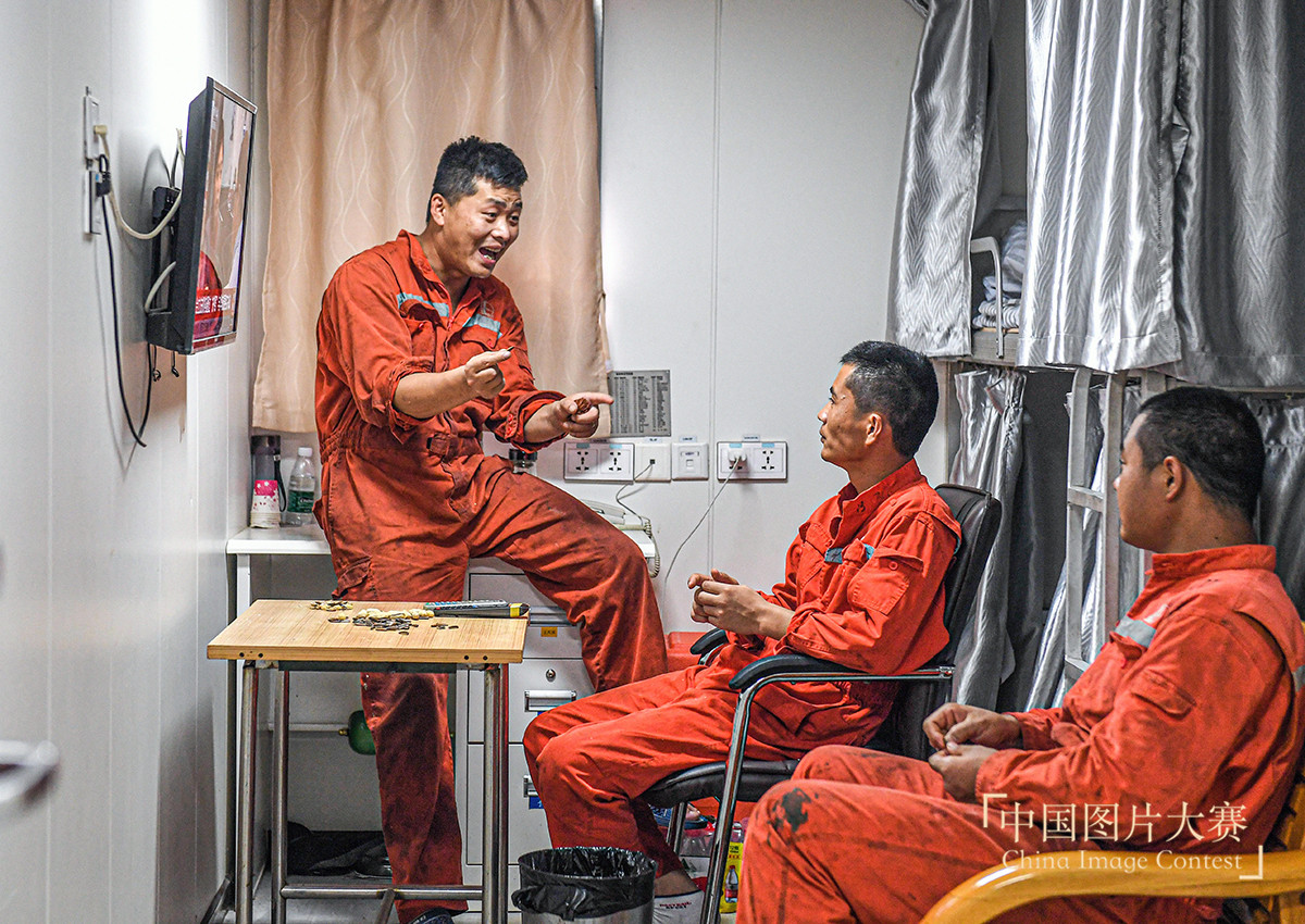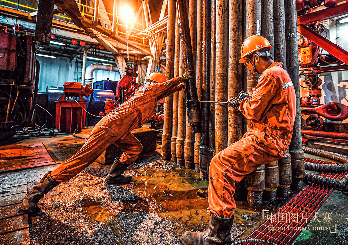 圖集說明:“勘探三號”鉆井平臺位于南海北部海域。工人們在這個高危、高溫、高濕和枯燥的環境中為祖國勘探海洋油氣資源。