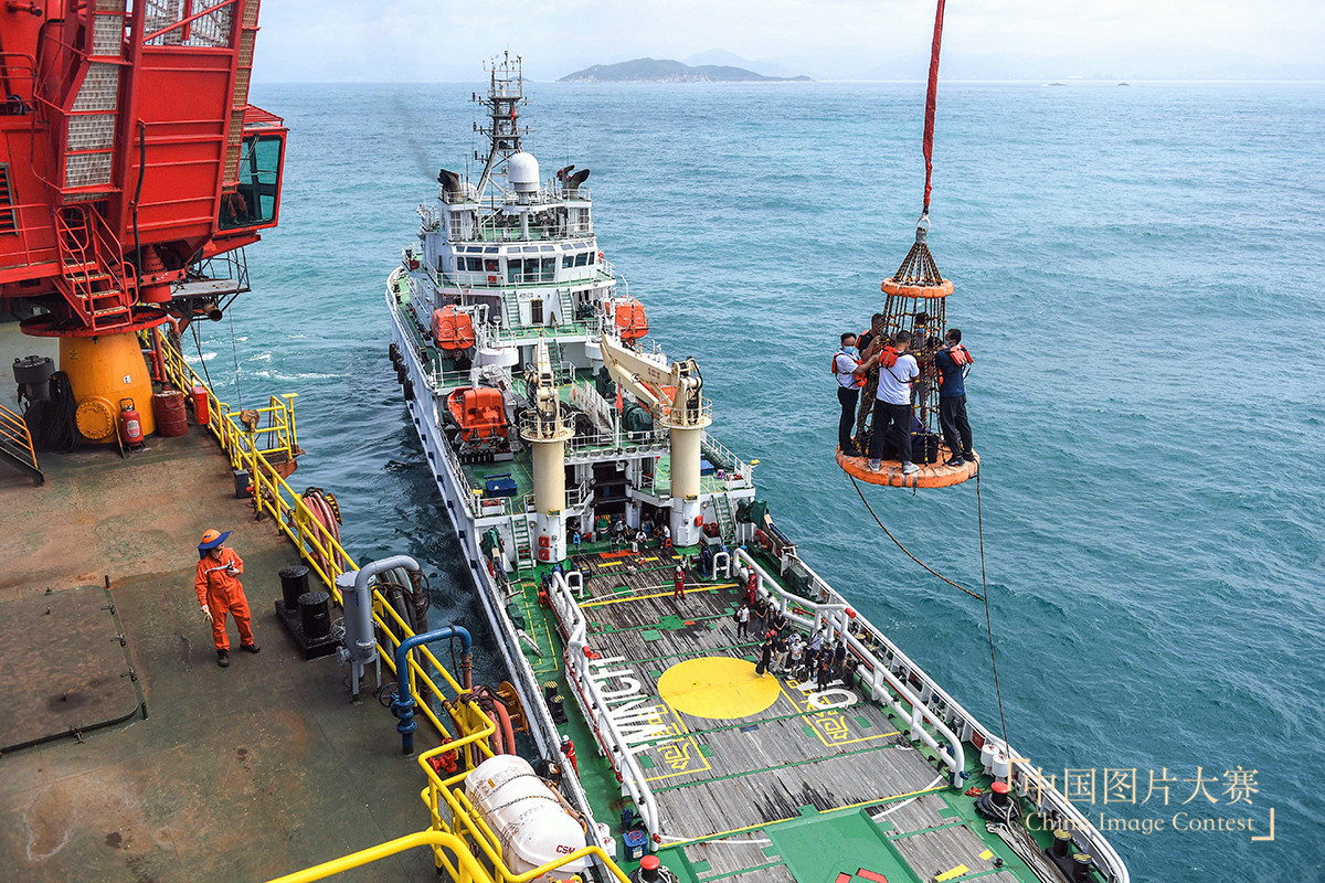 圖4:2020年7月10日,輪值的工人們乘船抵達勘探三號鉆井平臺附近,再乘坐由吊機牽引的吊籠登上鉆井平臺。
