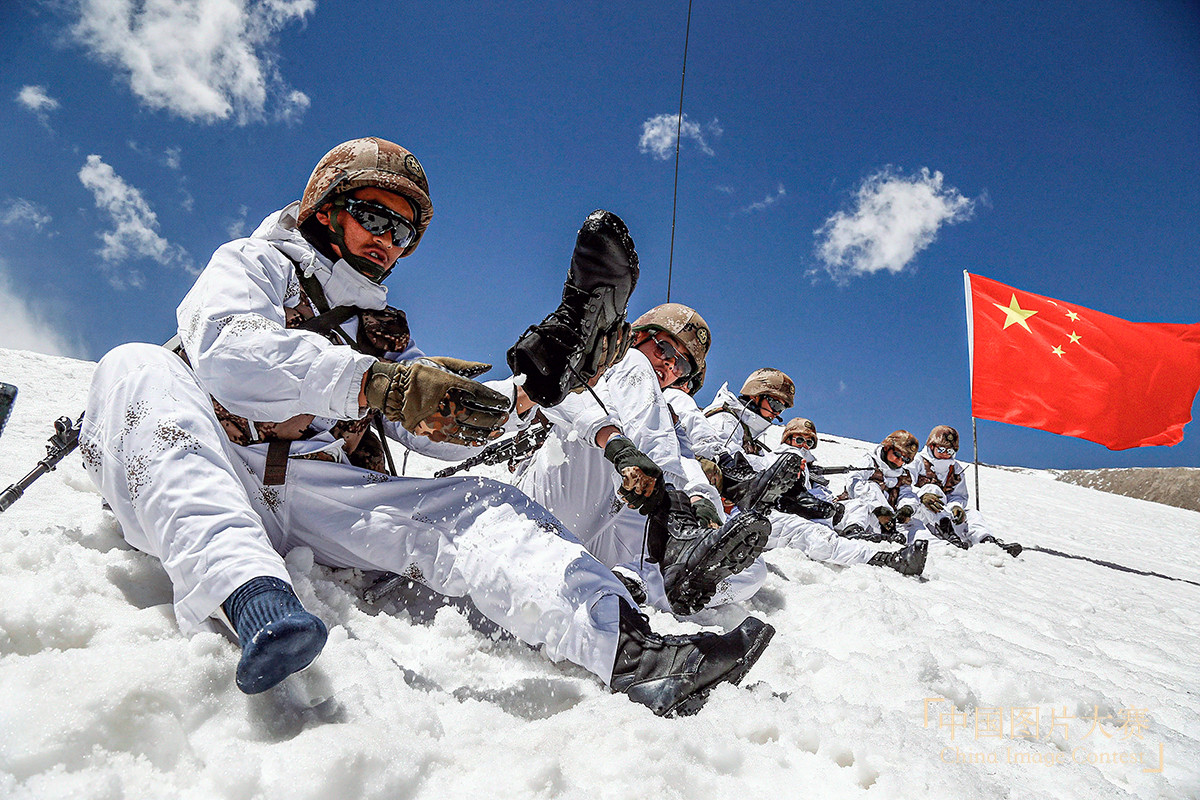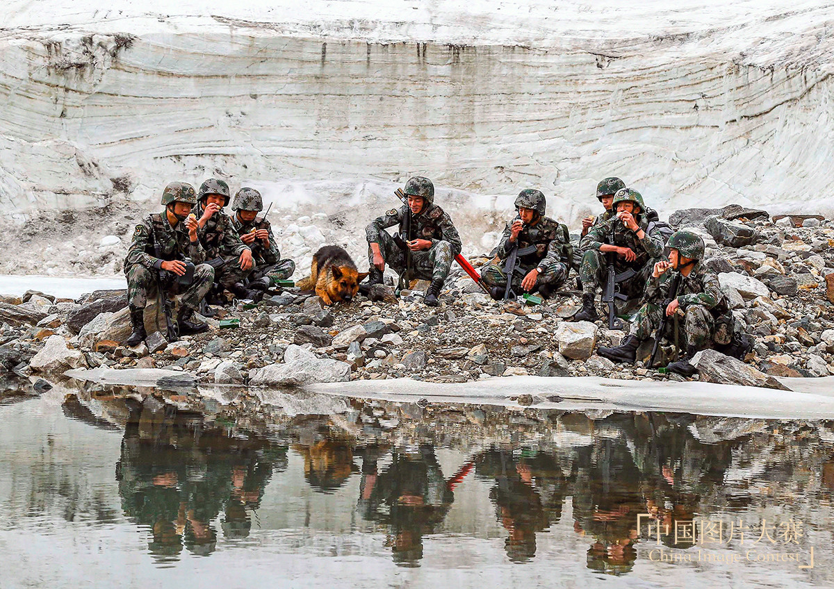 圖集說明:西藏阿里軍分區常年駐守在喜馬拉雅山、岡底斯山、喀喇昆侖山區域的雪域高原。在冰峰連綿、空氣稀薄、人跡罕至的“生命禁區”,阿里邊防軍人用腳步丈量著國境線。