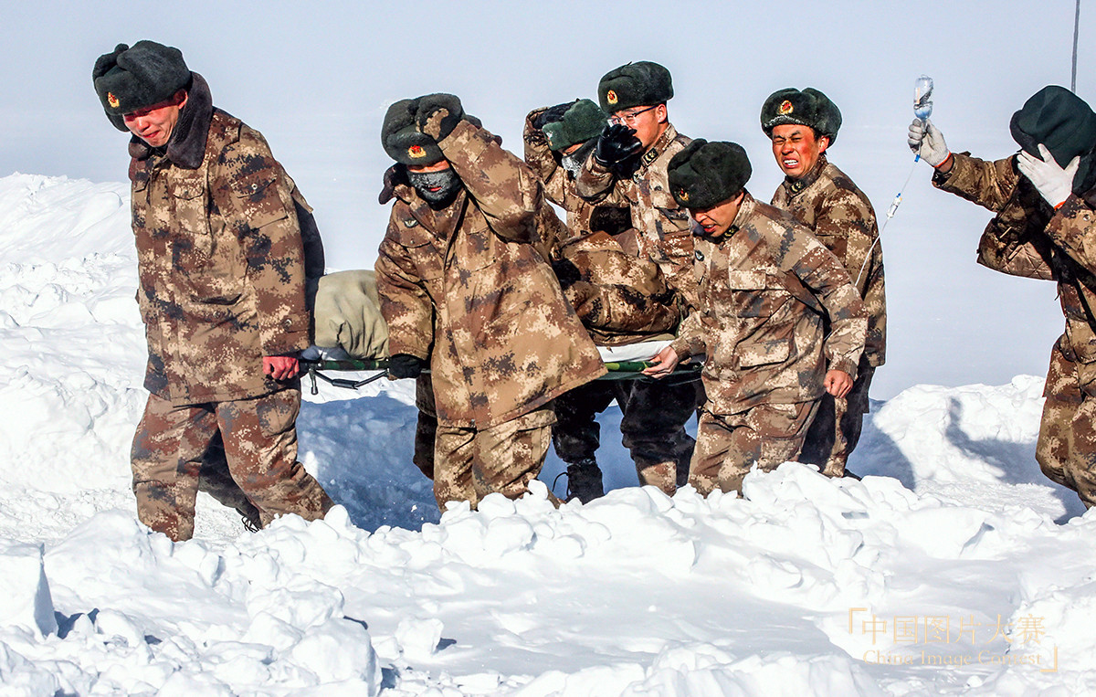 圖5:2019年1月28日,西藏阿里軍分區西蘭塔邊防連官兵用擔架將突發疾病的戰友送到直升機處,準備將他轉運至獅泉河鎮進行手術。