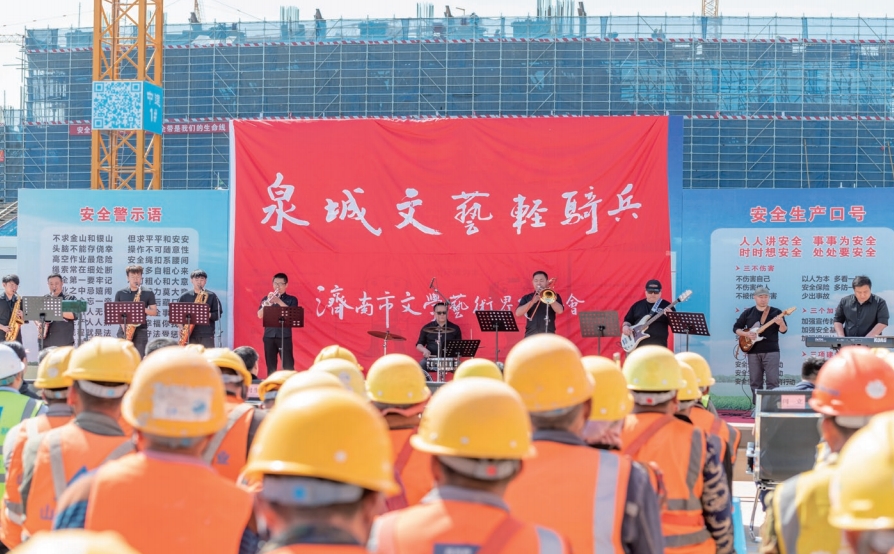 >> 2023年4月26日,濟南市直機關相關部門組織“泉城文藝輕騎兵”走進基層,為在建項目一線職工舉辦專場慰問演出。