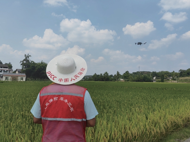 >> 人保財險農險工作人員在田地里使用無人機查勘,大大提升理賠效率。