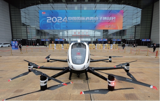 >> 2024年10月18日,在2024中國國際消費電子博覽會上展示的無人駕駛載人電動垂直起降航空器。
