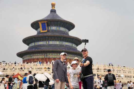 2024年7月9日,來自瑞士的游客在北京天壇公園祈年殿前合影。新華社記者 鞠煥宗 攝