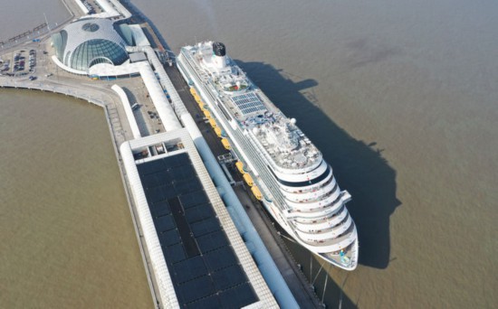 2024年1月1日,“愛達·魔都號”??吭谏虾卿量趪H郵輪港(無人機照片)。新華社記者 丁汀 攝