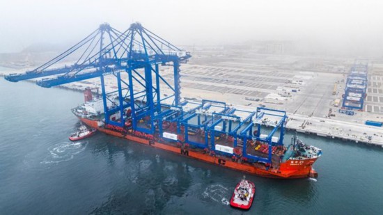 2024年6月27日,岸邊集裝箱起重機和軌道吊運抵秘魯錢凱港。新華社發(上海振華重工供圖)