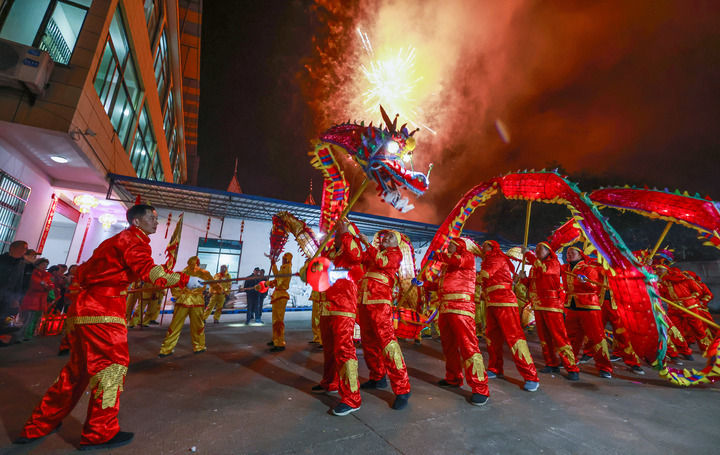 2024年2月10日,浙江省諸暨市安華鎮礦亭村村民進行舞龍表演,慶祝春節。新華社記者 徐昱 攝