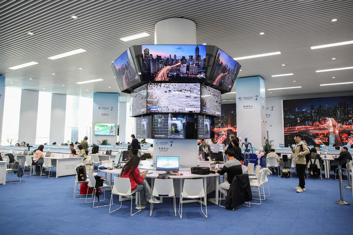 2024年11月8日,媒體記者在第七屆進博會新聞中心工作。新華社發(常能嘉 攝)