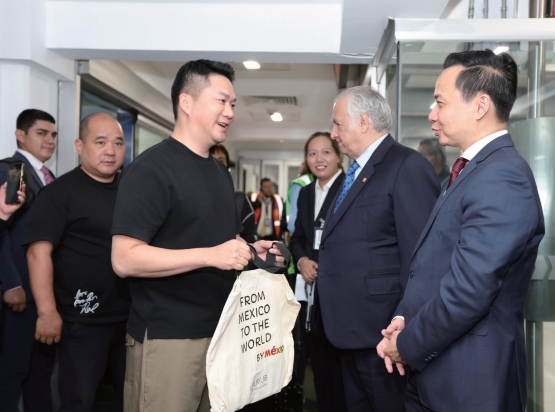 >> 2024年5月11日,時任駐墨西哥大使張潤(右一)向乘坐中墨直航航班抵墨乘客贈送紀念品及領事保護手冊。