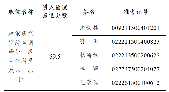 根據筆試成績由高到低順序,按照5:1的比例,確定參加面試人員。面試人員名單如下(按照準考證號排序):