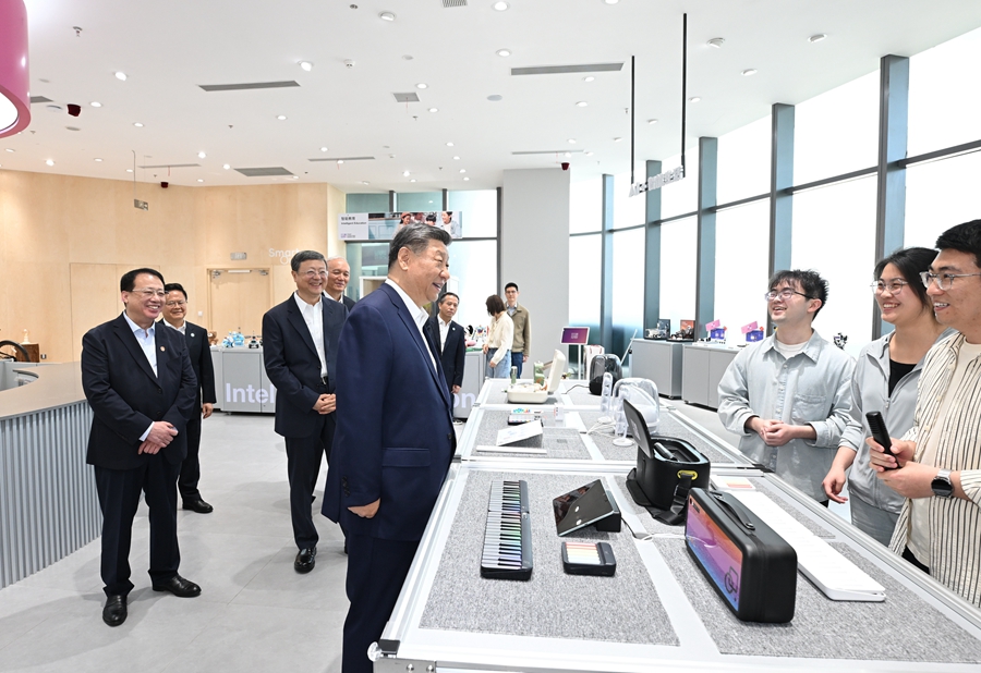 4月29日,中共中央總書記、國家主席、中央軍委主席習近平在上??疾?。這是習近平在位于徐匯區的上?!澳K倏臻g”大模型創新生態社區人工智能產品體驗店考察。新華社記者 謝環馳 攝