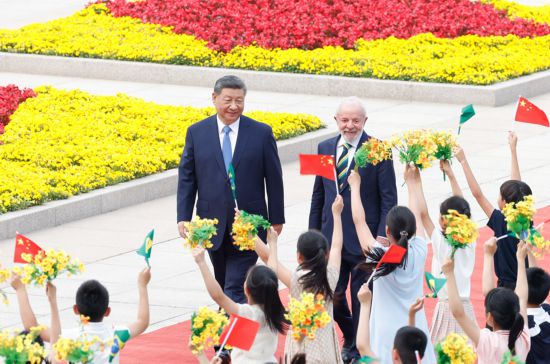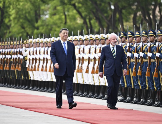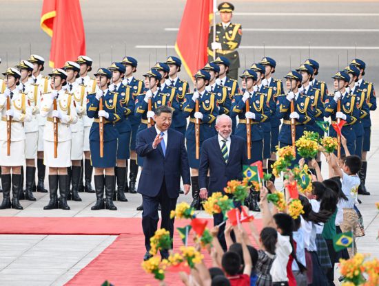 5月13日下午,國家主席習近平在北京人民大會堂同來華進行國事訪問的巴西總統盧拉舉行會談。這是會談前,習近平在人民大會堂東門外廣場為盧拉舉行歡迎儀式。新華社記者 黃敬文 攝