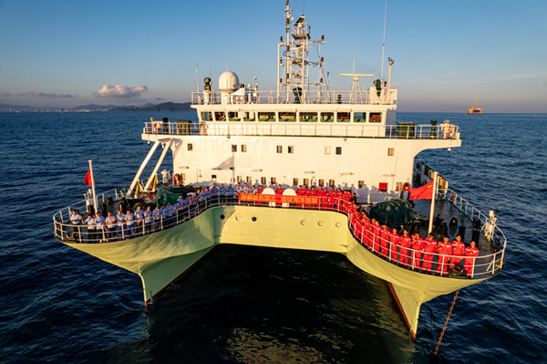 2023年秋季南海及西太海洋聲學考察航次臨時黨支部“立體觀測網”攻堅突擊隊隊員帶旗出征。