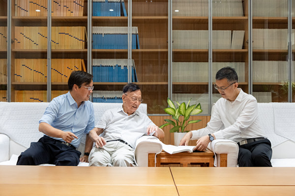 張仁和院士(中)與作者(右)、實驗室副主任汪?。ㄗ螅┯懻摻涣?。