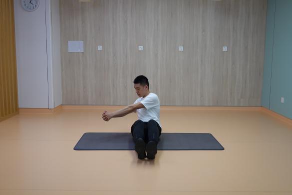 4、俄羅斯扭轉:臀部和腳跟支撐身體,雙手在身前合攏,腹部核心發力,軀干向左右扭轉,左右交替為1次,一組進行10-15次,重復2-4組,組間休息60秒。