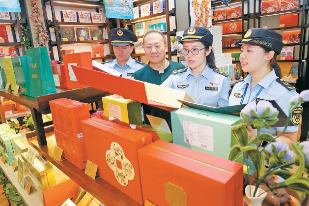 市場監管部門執法人員檢查月餅、茶葉過度包裝。