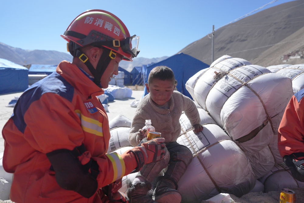 2025年1月8日,在西藏定日縣措果鄉塘仁村安置點,消防救援人員和小朋友互動。1月7日,西藏日喀則市定日縣發生6.8級地震。新華社記者 晉美多吉 攝