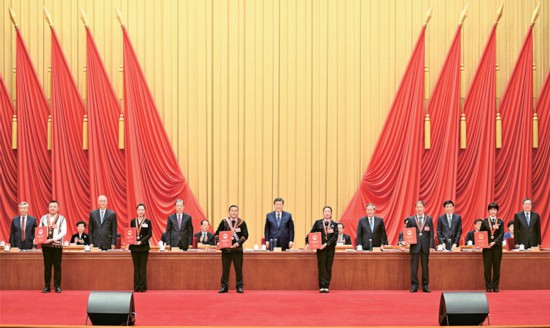 2024年9月27日,全國民族團結進步表彰大會在北京舉行。這是習近平等為受表彰的模范個人和模范集體代表頒獎。 新華社記者 李學仁/攝