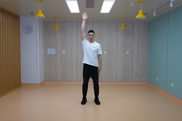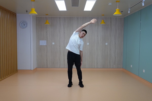 (1)背闊肌伸展:站姿,單側手臂上舉,向對側拉伸,保持3-5秒,單側進行3-5次為1組,交換對側,重復2-3組,組間休息60秒。