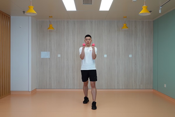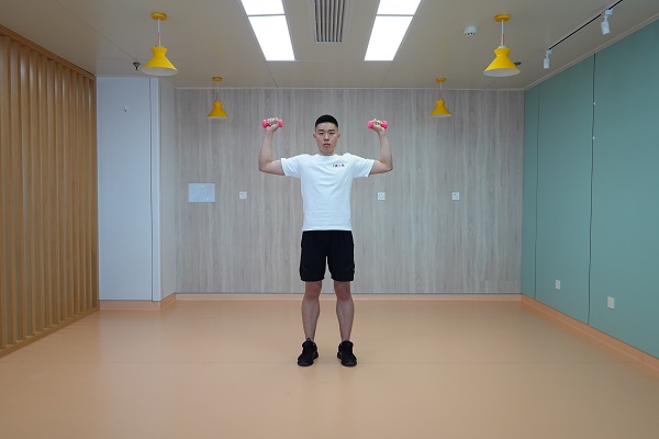 2、直臂上拉加轉向:雙腳開立與肩同寬,腰背挺直,雙手握啞鈴在身體前側,手心朝向身體,雙臂用力向上提拉至啞鈴與肩同高,手臂旋轉至肩關節外展90度,前臂與上臂呈90度姿勢,再緩慢回到起始位。10-12次為一組,做2-3組。