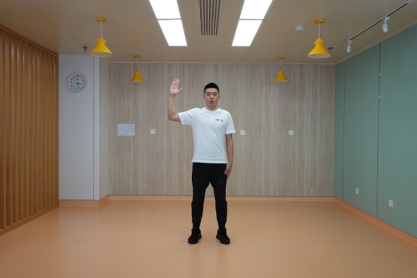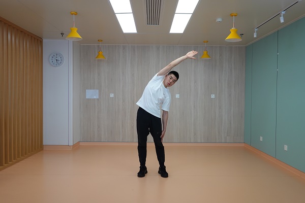 1、體側屈:站姿,一側手側平舉,肘關節屈曲,向對側伸展,保持3-5秒,交換對側,單側進行3-5次為1組,重復2-3組,組間休息60秒。