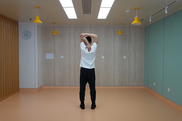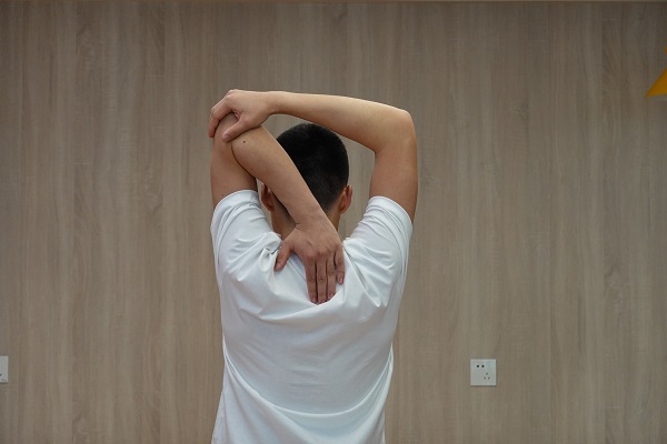 2、三頭?。赫咀?,雙手在背后,一側手抓住另一側肘關節并用力,保持3-5秒,單側進行3-5次為1組,交換對側,重復2-3組,組間休息60秒。