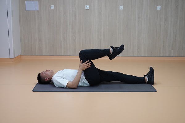 5、臀部靈活性:仰臥在瑜伽墊上,單腿屈曲,兩手抱住屈曲側大腿,向軀干拉伸,保持3-5秒,交換對側,單側進行3-5次為1組,重復2-3組,組間休息60秒。