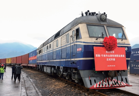 2024年1月,恩施至寧波舟山港鐵海聯運通道正式開通?!岸魇┪琛贝畛髓F海聯運快車飄香海外。
