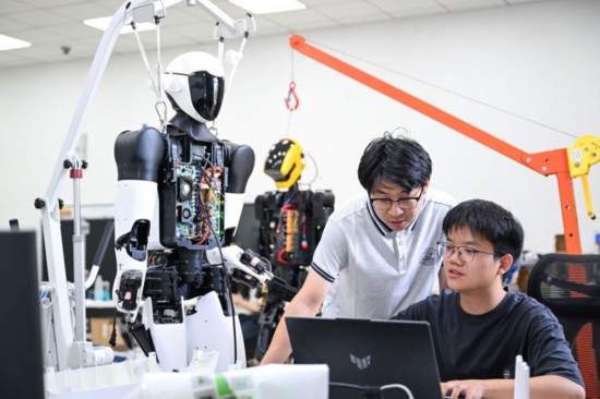 2025年5月29日,在位于湖北省武漢市的華中科技大學機械科學與工程學院,研究人員對“荊楚”人形機器人進行代碼調試。新華社記者 杜子璇 攝